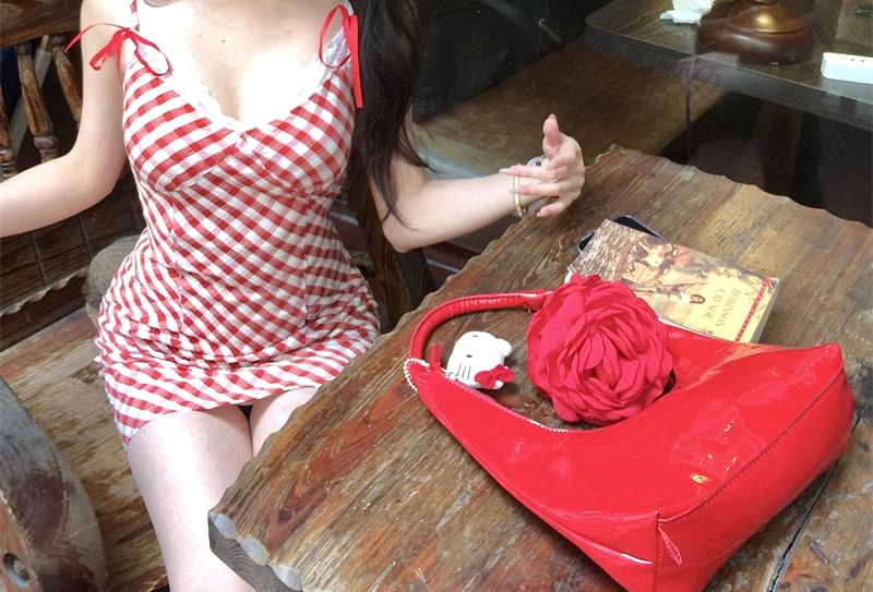 Spaghetti Strap Plaid Lace Trim Bow Mini Bodycon Dress