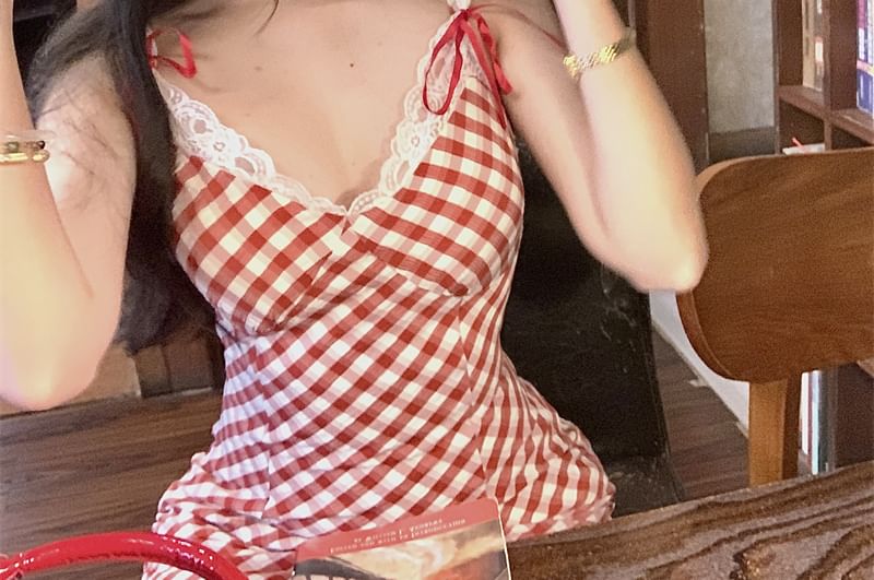 Mini Trim Spaghetti Bodycon Lace Bow Strap Plaid Dress