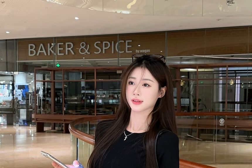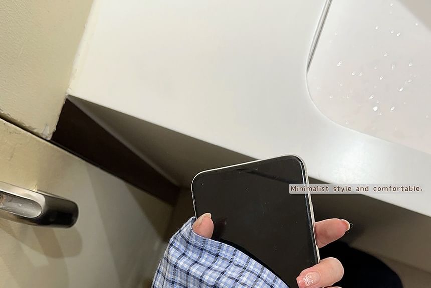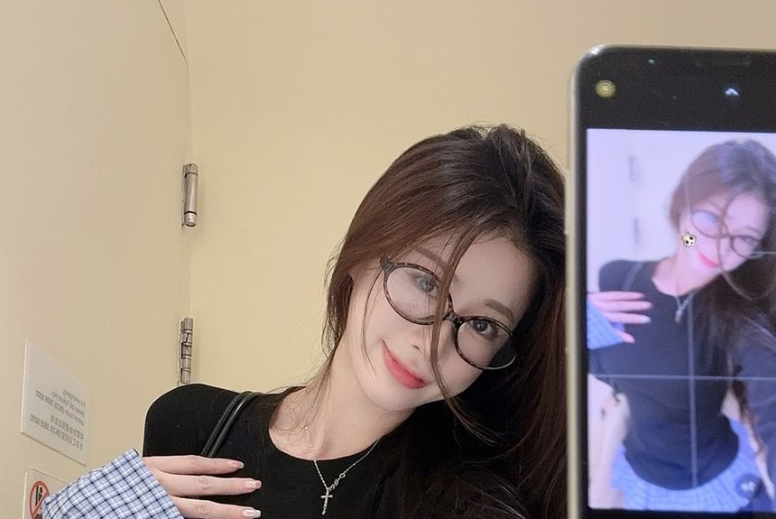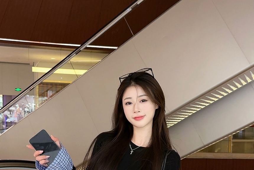 Mock Two-Piece Long-Sleeve Plaid Hem Top
