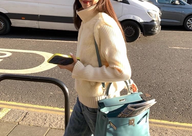 Mock Two-Piece Turtleneck Plain Fleece Panel Ribbed Zip Cardigan