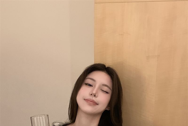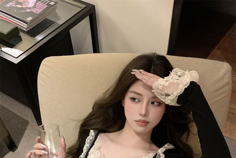 Neck Top Scoop Lace Crop Long Trim Sleeve Plain