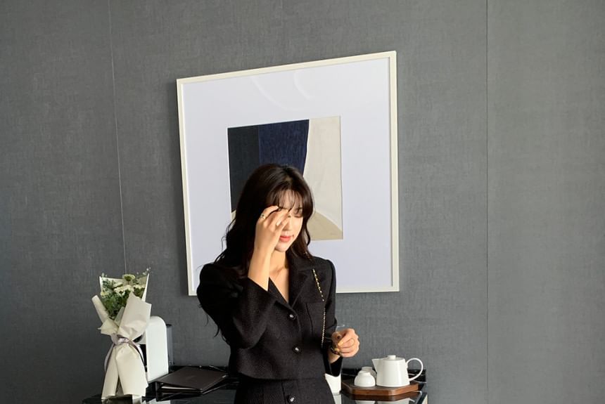 Notch Lapel Single-Breasted Plain Tweed Crop Blazer / High Rise Slit Midi Pencil Skirt