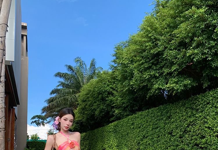 Open Accent Dress Tie Back Maxi A-Line Neck Dye Floral Halter Ruched