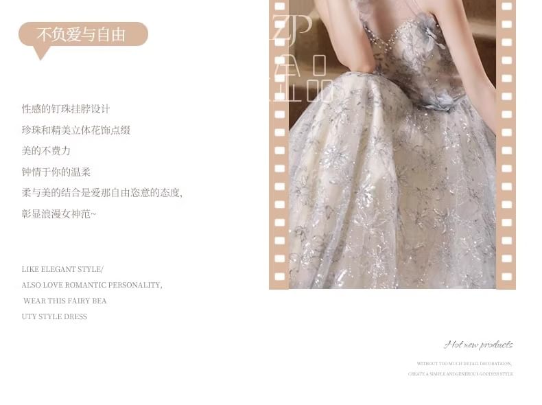 Sleeveless Round Neck Floral Patterned Faux Pearl Mesh A-Line Evening Gown