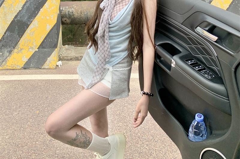Sleeveless Cowl Neck Plaid Mock Two Piece Top