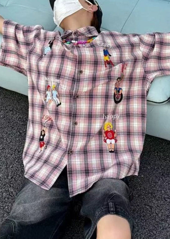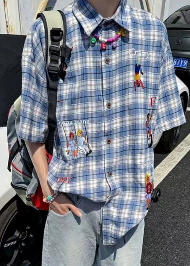 Plaid Button Print Half Men's Shirts Blue Cotton Classy Sleeve