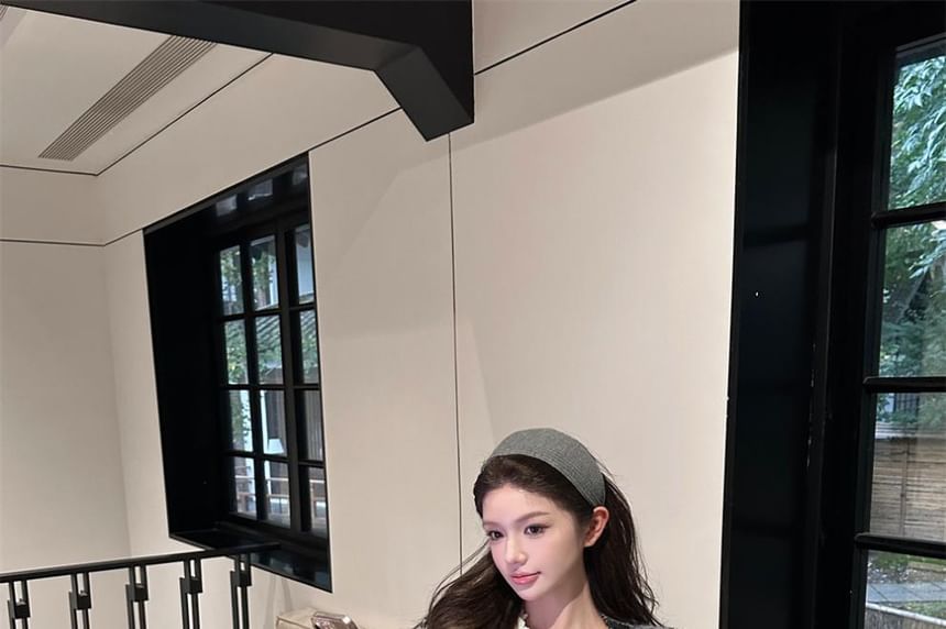 Plaid Tweed Jacket / Long-Sleeve Plain Blouse / Mini Skirt