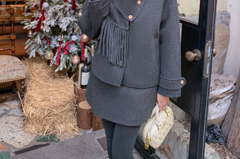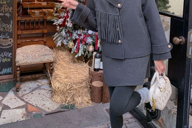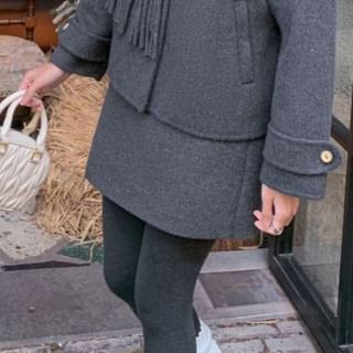 Plain Button Up Wool Jacket / High Waist Plain Mini A-Line Skirt