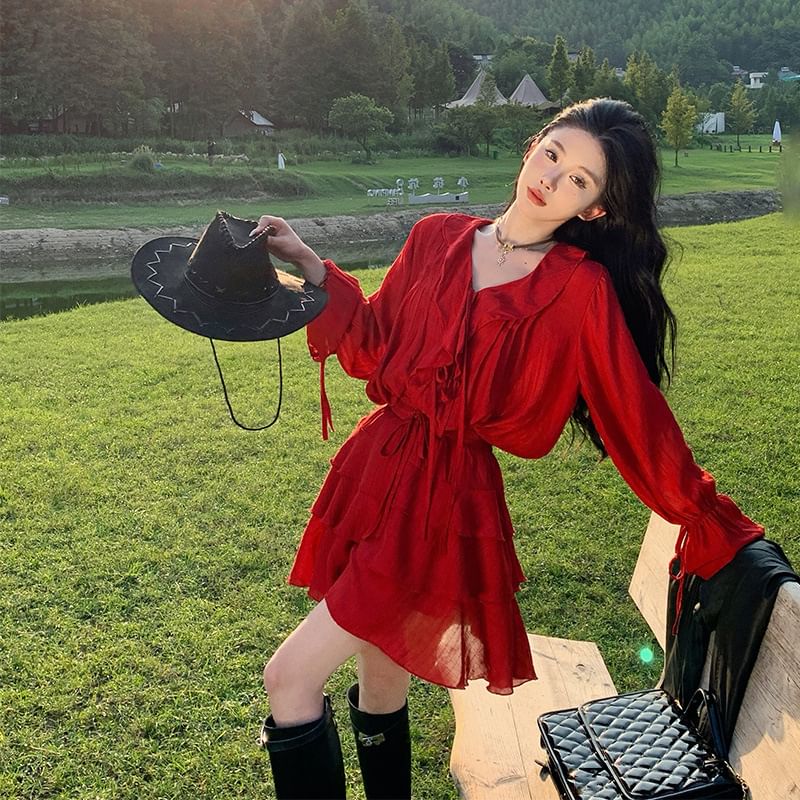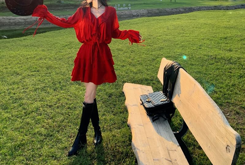 Plain Skirt Blouse Mini + A-Line Long-Sleeve Set: V-Neck Tiered