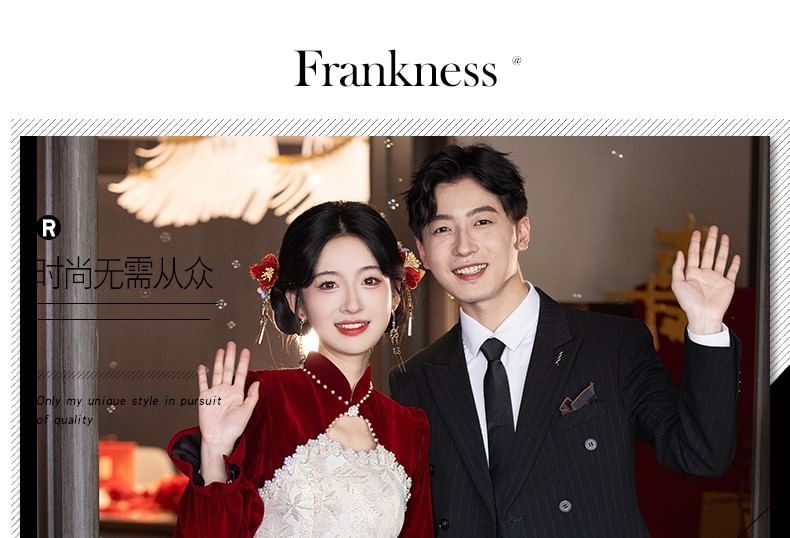 Puff-Sleeve Floral Jacquard Faux Pearl A-Line Chinese Wedding Dress