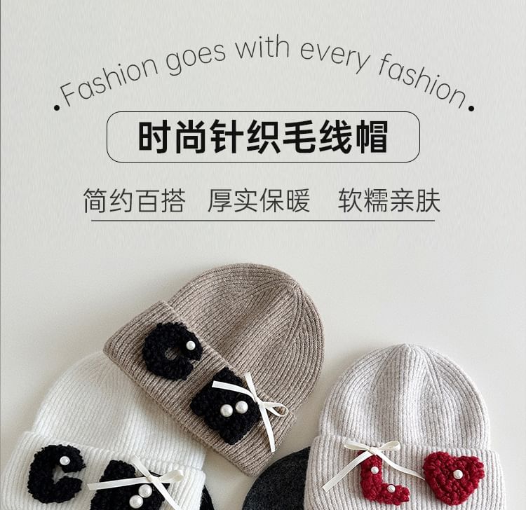Ribbon Faux Pearl Chenille Applique Knit Beanie