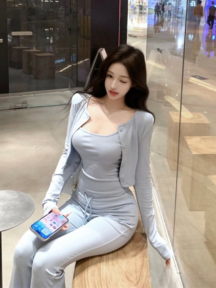 Scoop Neck Plain Crop Camisole Top / Drawstring Waist Flared Pants / Crew Neck Button-Up Cardigan