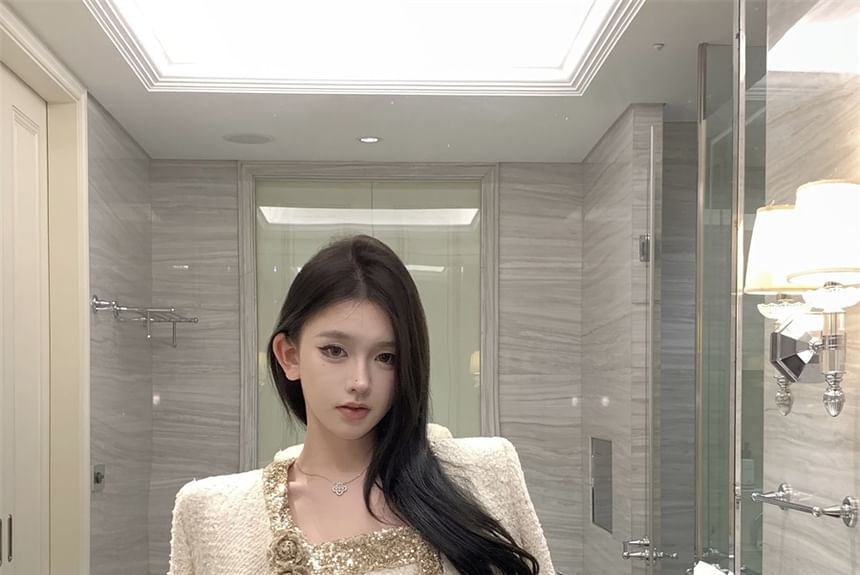Set: Spaghetti Strap Glitter Tweed Mini A-Line Dress + Flower Crop Cardigan