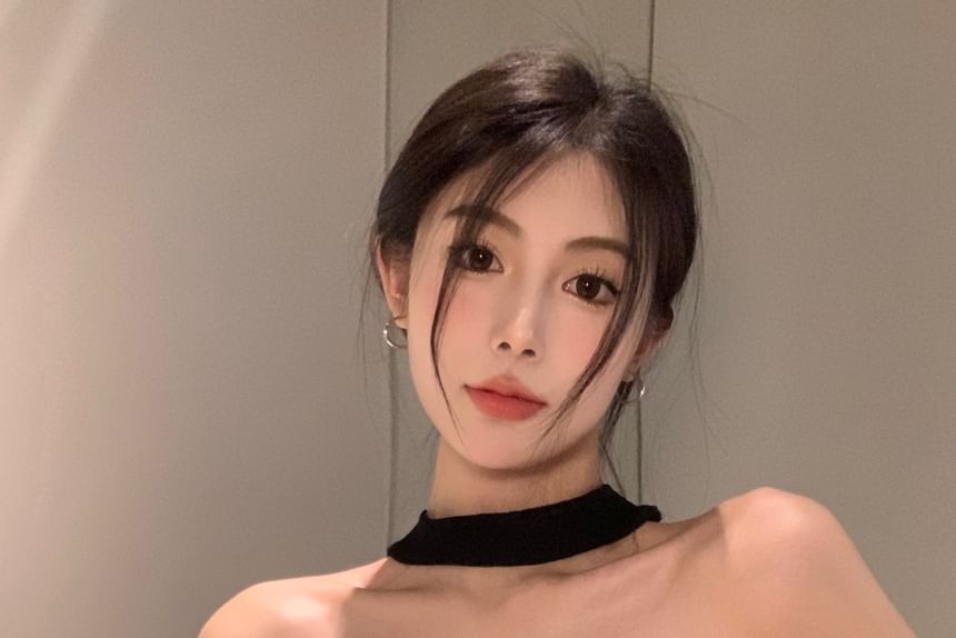 Shoulder Plain Fit Short-Sleeve Slim Crop Halter Top Neck Off