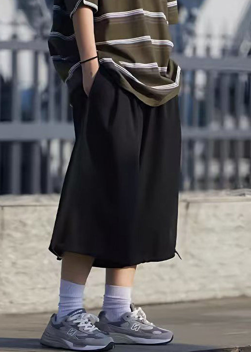 Simple Grey Pockets Drawstring Ice Silk Men Crop Pants Summer