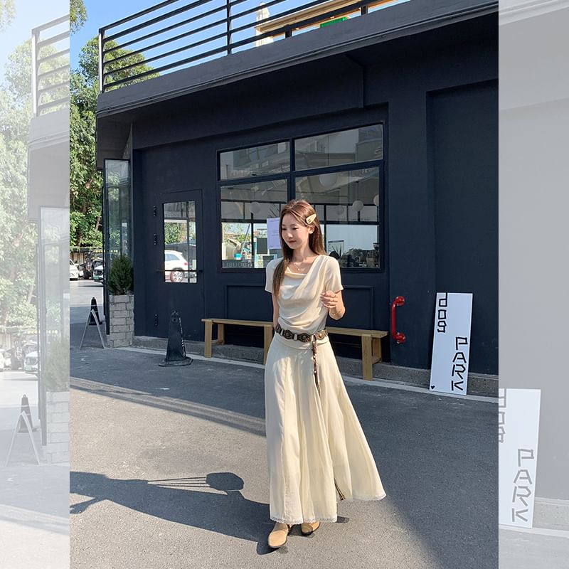 Slim Cowl Short-Sleeve Neck Ruched T-Shirt Fit Plain