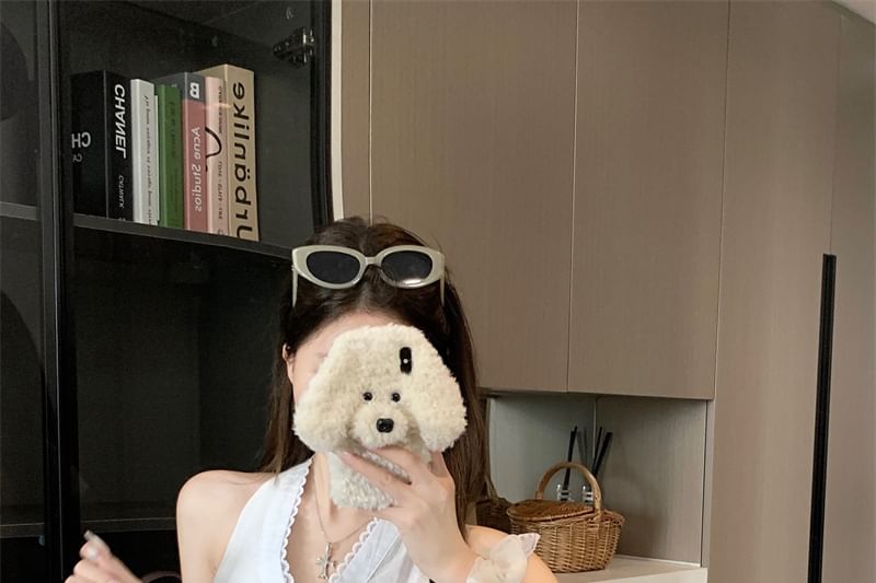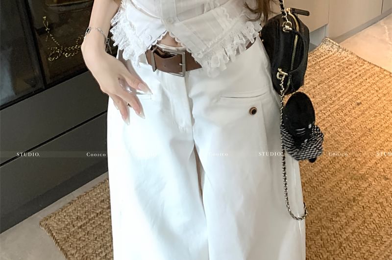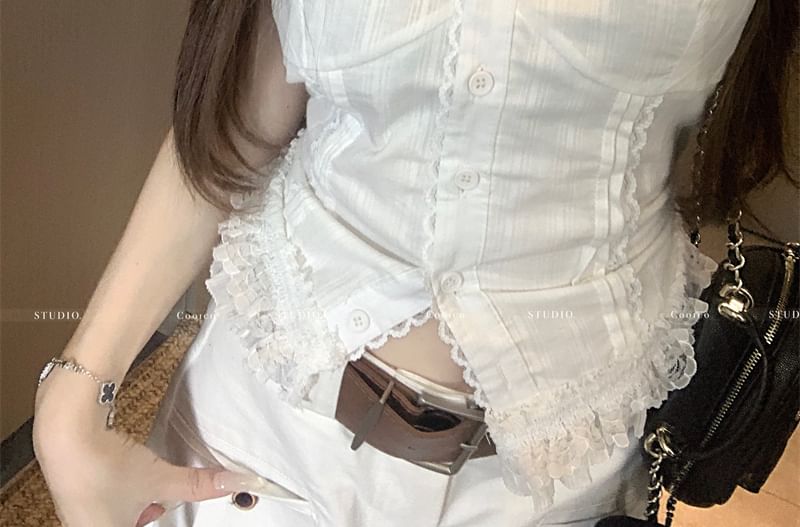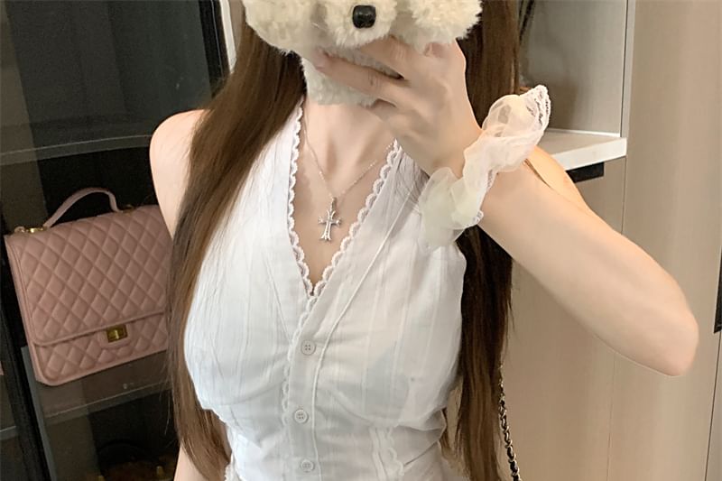 V-Neck Plain Lace Trim Button Slim Fit Tank Top