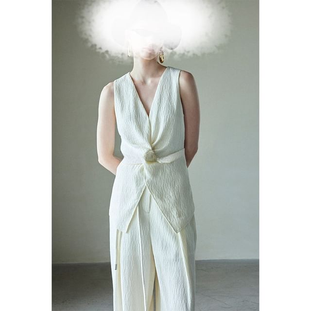 V-Neck Plain Knot Slit Tank Top / High Rise Wide Leg Pants
