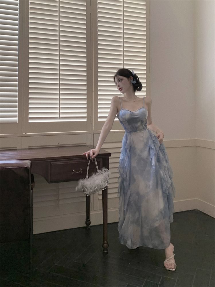 Spaghetti Tie Hem Ruffle Sun Chiffon Dress Dye Strap Maxi