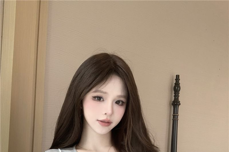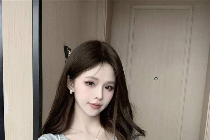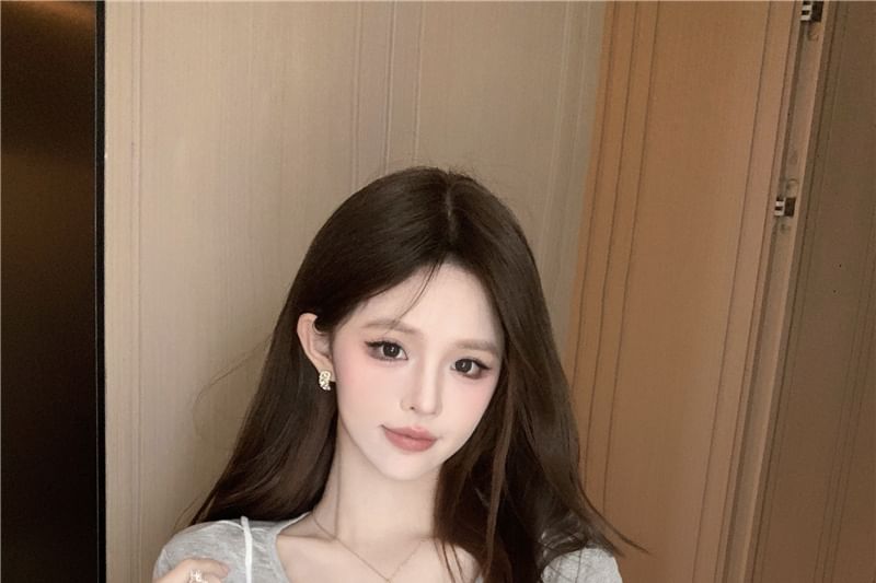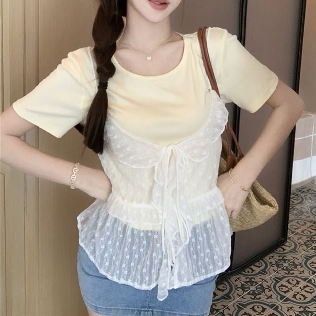 Set: Short-Sleeve Crew Neck Plain Tee + Floral Ruffle Sheer Cami Top