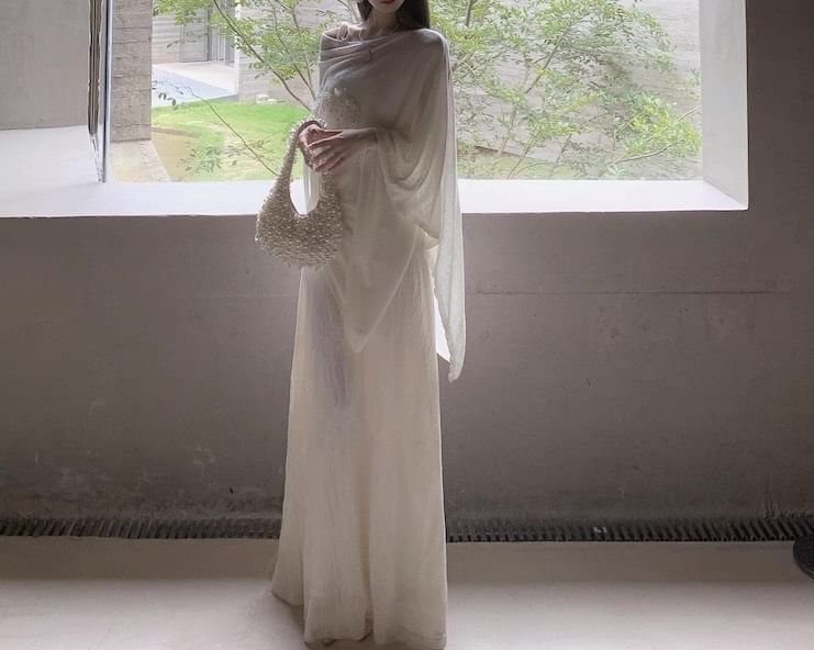 Tie Shoulder Plain Floral Applique Maxi A-Line Dress / Cape