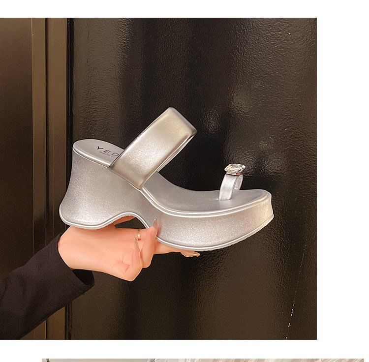 Rhinestone Toe Loop Platform Wedge Heel Slide Sandals