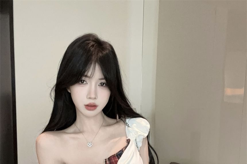 Top Crop Trim Plaid Cap-Sleeve Two-Piece Mock