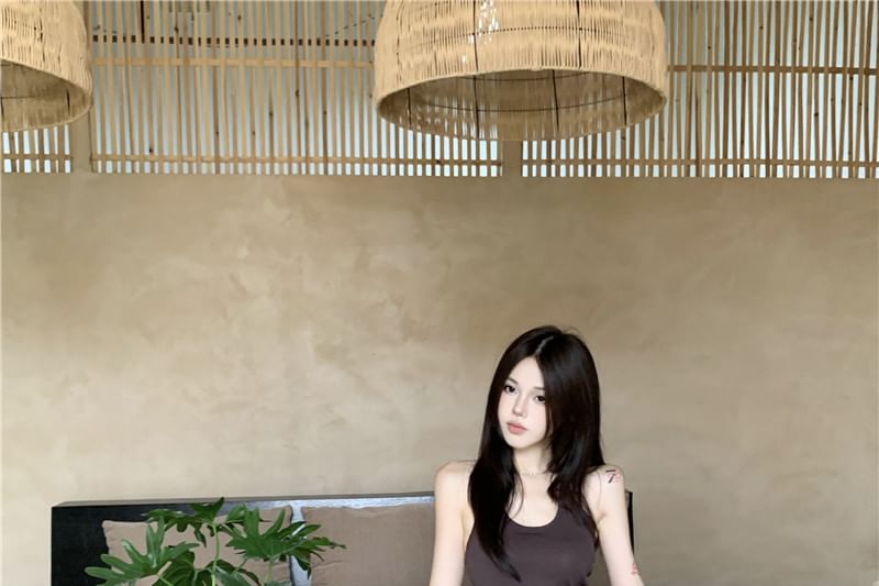 Scoop Neck Plain Tie Waist Halter Top / High Waist Maxi A-Line Skirt