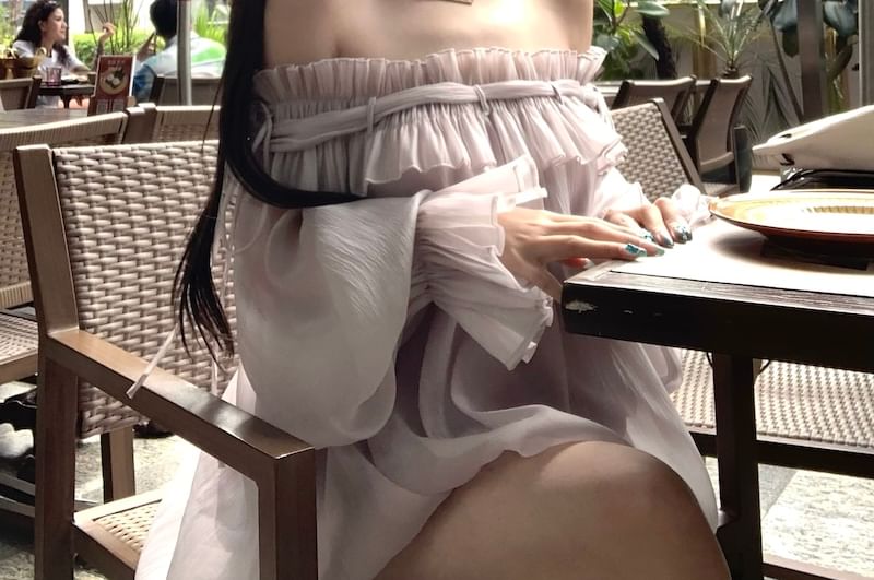 Long-Sleeve Off-Shoulder Plain Ruffle Trim Tunic Blouse