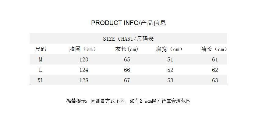| Chest | Total Length | Shoulder Width | Sleeve Length |