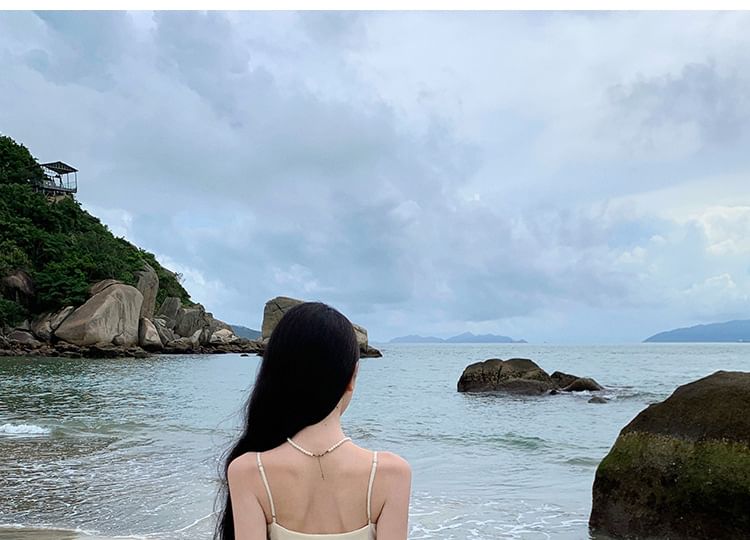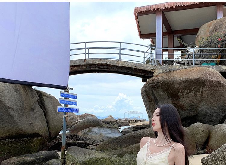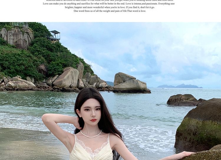 V-Neck Maxi Ruched Plain Slit Strap Spaghetti A-Line Lace Panel