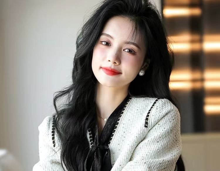 V-Neck Sequin Contrast Trim Button-Up Tweed Jacket