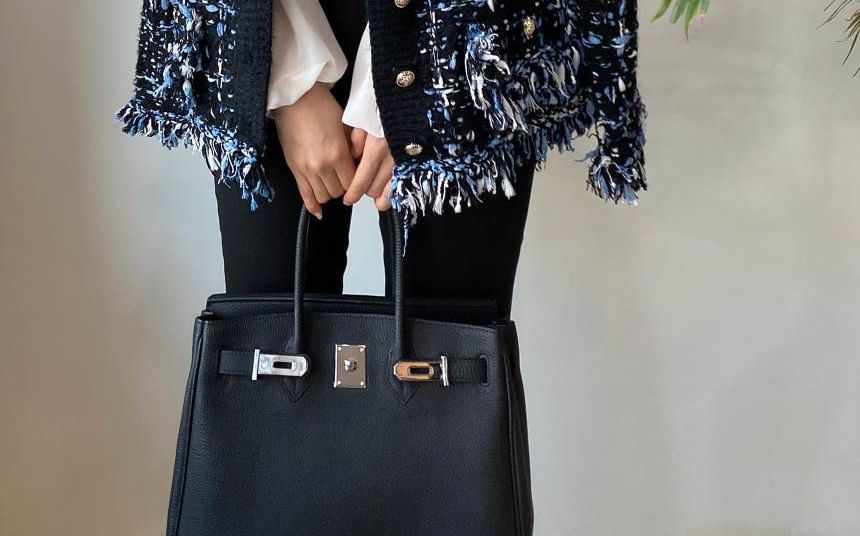 V-Neck Tweed Tasseled Button-Up Cardigan